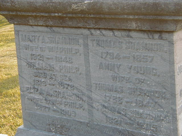 Mary Ann Young Shannon was born on 26 November 1821 at Brandon, Cork Co., Ireland; Date Nov 26 1821 & location Cork Co., Ireland from page 52, "Ours To Remember", book by Mary Ann Down, Sep. 3, 2004. 1851 census makes a pervious wife likely?? Brandon from page 151 of "Ours To Remember" by Mary Ann Down, given to me by Shirley (Goodfellow) Bird, Sep. 3, 2004.1 As of 1 January 1842,her married name was Philp. She married William Oke Philp, son of John Philp and Mary Oke, on 1 January 1842 at Cramahe Twp., Northumberland Co., Ontario; Date Jan 1, 1842 & location Cramahe from page 47, "Ours To Remember", book by Mary Ann Down, Sep. 3, 2004.1 Mary Ann Young Shannon died on 1 September 1848 at Cramahe Twp., Northumberland Co., Ontario, at age 26; "Bytown, Sept. 6, 1848. Mrs. M. A. Y. Philp, of Cramahe - Died on the 1st instant, in Cramahe, Mrs. M. A. Y. Philp. She was the daughter of Thomas and Anna Shannon, and was born in the County of Cork, Ireland, on the 26th of November, 1821. When quite young she emigrated with her parents to Canada, and settled in Cramahe... It was in January, 1842 that Miss M. A. Y. Shannon was united in marriage to Mr. W. Philp ... until the first of September, 1848, when the tenderest of earthly ties was broken by death. Sister Philp left behind her an affectionate husband and three children to mourn her loss ... " from page 52, "Ours To Remember", book by Mary Ann Down, Sep. 3, 2004.1 She was buried on 3 September 1848 at Salem Cemetery, Cramahe Twp., Salem, Northumberland Co., Ontario; CEMSearch: Name: Mary Ann Philp: Maiden: Shannon; Born: 1821; Died: 1848; Notes: Wife of William Philp; Buried: Salem Cemetery, Sec NW; Other names: Anny Shannon (Young) (1788-1847), Eliza Ann Philp (Shannon) (1827-1909), Eliza J. Philp (1847-1854), James A. Philp (1863-1863), James Shannon (1835-1920), Mary Sophrona Philp (1794-1857), Thomas Shannon (1821-1905), William Philp (1819-1878)