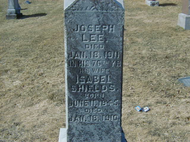 Note: Wife's name is Isabella here but Elizabeth in Thomas' marriage reg'n.???8 He appeared on the census of April 1901 at Cramahe Twp., Northumberland Co., Ontario; Age 65 at 1901 Census: Lee, Joseph, 65, b. Ont. r. Sep 12 1835, Ger., Bapt., farmer, married; Isabella M., 56, b. England Jun 11 1844, Eng., Bapt., married; Charles H., 18, b. Ont. r. Aug 12 1882, Ger., son; Maud B., 14, b. Ont. r. May 13 1886, daughter (1901 Census Online: Cramahe, dist. 95, sub-dist. 3-2, pg. 3, line 41, T-6485 - Conc 3, Lot 25.)4 He lived in April 1901 at Conc 3 Lot 25, Cramahe Twp., Northumberland Co., Ontario; Residence per 1901 Census: Conc 3, Lot 25, Cramahe Twp.4 He died on 18 June 1911 at Cramahe Twp., Northumberland Co., Ontario, at age 74; Date Jun 18 1911 per IGI Record.6 He was buried on 20 June 1911 at Salem Cemetery, Cramahe Twp., Salem, Northumberland Co., Ontario; Memorial: (See Exhibit) Joseph; Lee; Died; Jan 18, 1911; In His 76th Year; His Wife; Isabel; Shields; Born; June 11, 1845; Died; Jan 18, 1910 (Salem Cemetery, Apr 2, 2006)