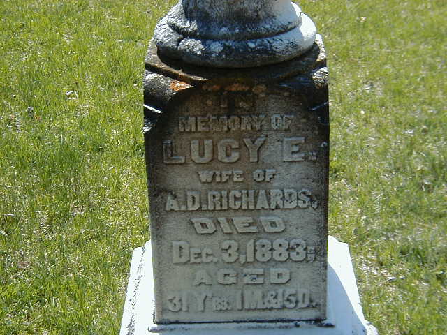 Lucy Emily Valleau was born on 18 October 1852 at Brighton Twp., Northumberland Co., Ontario; Date Oct 18 1852 per Memorial - age 31y 1m 15d at death Dec 3 1883. Date 1853 & location Ont. per 1881 Census. Date per 1871 Census: see Jesse Valleau.1,2 She appeared on the census of 1861 at Brighton Twp., Northumberland Co., Ontario; Age 9 at 1861 Census: see Jesse Valleau.3 She appeared on the census of April 1871 at Brighton Twp, Northumberland Co., Ontario; Age 19 at 1871 Census: see Jesse Valleau.4 She married Alfred Dempsey Richards, son of William Augustus Richards and Mariah ?, before 1878 at Northumberland Co., Ontario; Date "after 1873 per "William A. Richards" bio of same, sent to me via email by James Richards, Oct 29 2011. per GEDCOM of Rich Turnblom, March 29, 2005. Can not find any marriage registration for them in Ancestry.com!!5,6 As of after 1878,her married name was Richards.5 Lucy Emily Valleau appeared on the census of April 1881 at Brighton Twp., Northumberland Co., Ontario; Age 28 at 1881 Census: see Alford D. Richards.1 She died on 3 December 1883 at Brighton Twp., Northumberland Co., Ontario, at age 31; Date Dec 3 1883 per Memorial. Date Dec 3 1883 per "William A. Richards" bio of same, sent to me via email by James Richards, Oct 29 2011.2,6 She was buried on 5 December 1883 at Warkworth Cemetery, Warkworth, Northumberland Co., Ontario; Memorial: (See Exhibit) In; Memory of; Lucy E; Wife of; A. D. Richards; Died; Dec. 3, 1883; Aged; 31 Y'rs 1 M & 15 D (Warkworth Cemetery, Warkworth, Apr 28, 2007.)2