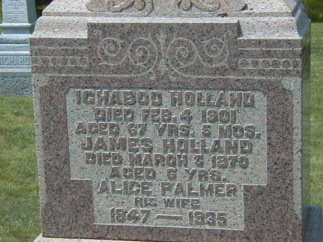 Cemetery Transcription: See Exhibit: Ichabod Holland; Died Feb 4 1901; Aged 67 Yrs. 5 Mos; James Holland; Died March 3 1870; Aged 6 Years; Alice Palmer; His Wife; 1847-1935 (McPhail's Cemetery, June 8, 2002)