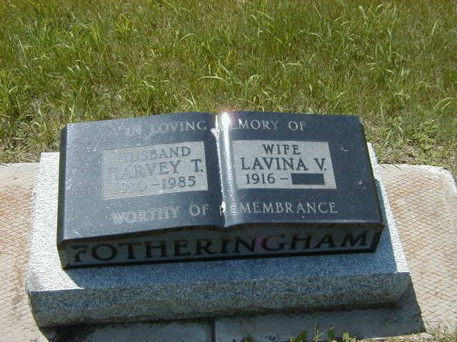 Harvey T. Fotheringham was born in 1910 at Saskatchewan; Date 1910 per Burial. per GEDCOM of Dennice Goudie, March 31, 2002.1 He was buried in November 1985 at Grenfell Cemetery, Grenfell, Saskatchewan; Memorial: (See Exhibit) In Loving Memory of; Husband; Harvey T; 1910 - 1985; Wife; Lavina V; 1916 - ; FOTHERINGHAM (Grenfell Cemetery, Grenfell, July 13, 2005.)1 He died in November 1985 at Grenfell, Qu'Appelle District, Saskacthewan; Date 1985 per Burial. Date Nov 1985 per GEDCOM of Dennice Goudrie, March 31, 2002.1