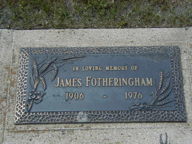 James Alexander Fotheringham was born on 23 July 1906 at Grenfell, Saskatchewan; Date Jul 23 1906 & location Grenfell per Jolly book, copied at Grenfell July 13, 2005. Not in 1901 Census. per GEDCOM of Dennice Goudie, March 31, 2002. Date Jul 1906 per 1911 Census.1,2 He appeared on the census of 1911 at Township 17 Range 7 West of 2nd Meridian, Grenfell, Qu'Appelle Dist., Saskatachewan; Age 4 at 1911 Census: see James Fotheringham.2 He married Grace Margaret Riley after 1925. James Alexander Fotheringham was buried in 1976 at Grenfell Cemetery, Grenfell, Saskatchewan; Memorial: (See Exhibit) In Loving Memory of; James Fotheringham; 1906 - 1976 (Grenfell Cemetery, Grenfell, July 13, 2005.)3 He died in 1976 at Saskatchewan; Date 1976 per Burial.3