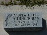 Andrew Telfer Fotheringham was born on 11 November 1908 at Saskatchewan; Date Nov 11 1908 per Burial - guessing this is the right Andrew?? per GEDCOM of Dennice Goudie, March 31, 2002.1 He died on 19 January 1997 at age 88; Date Jan 19 1997 per Burial.1 He was buried on 21 January 1997 at Grenfell Cemetery, Grenfell, Qu'Appelle District, Saskatchewan; Memorial: (See Exhibit) Andrew Telfer; Fotheringham; November 11, 1908; January 19, 1997 (Grenfell Cemetery, Grenfell, July 13, 2005.)1