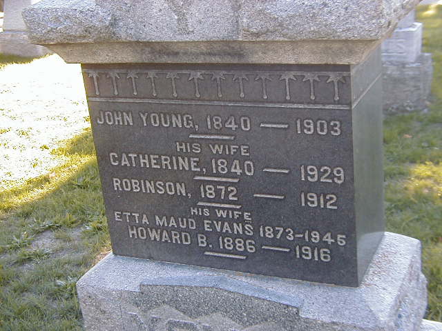 Date 1929 per Memorial.6,12 She was buried on 9 May 1929 at St. George's Cemetery, Trenton, Northumberland Co., Ontario; Memorial: (See Exhibit) John Young, 1840 - 1903; His Wife; Catherine, 1840 - 1929; Robinson, 1872 - 1912; His Wife; Etta Maud Evans 1873 - 1945; Howard B., 1886 - 1916 (St. George's Cemetery, Trenton, Sep 24 2005.)6,7