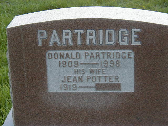 Donald George Thomas Partridge was born on 19 June 1909 at Percy Twp., Northumberland Co., Ontario; Date Jun 19 1909 per Burial. Location Percy Twp. per Burial.1 He died on 8 January 1998 at Ontario at age 88; Date Jan 8 1998 per Burial.1 He was buried on 11 January 1998 at Warkworth Cemetery, Warkworth, Northumberland Co., Ontario; Memorial: (see Exhibit) Donald Partridge; 1909 - 1998; His Wife; Jean Potter; 1919 - (Warkworth Cemetery, May 1, 2003)