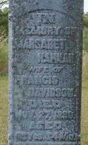 Margaret Hannah Richmond was born in 1839 at Cramahe Twp., Northumberland Co., Upper Canada; Date 1841 & location Ont. per 1891 Census. Date 1841 & location Ont. per 1881 Census. Date 1841 & location Ont. per 1871 Census. Date 1840 & location UC per 1861 Census. Date 1839 & location Cda. per 1851 Census.3,4,5,6,7 She appeared on the census of March 1852 at Brighton Twp., Northumberland Co., Canada West; Age 12 at 1851 Census: see David Richmond.8 As of before 1860,her married name was Davidson. She married Francis Davidson, son of William Davidson and Elizabeth Ann Hill, before 1860 at Northumberland Co., Canada West; "William Davidson. The Children and Grandchildren: II. Francis Davidson, m. Margaret Richmond; set. Brighton. Issue: (1) Lizzie, (2) Ida, and (3) David R." from "Pioneer Life on the Bay of Quinte", pg. 267. per marriage reg'n. of daugher Ida V. (Davidson) Ireland.9,10 Margaret Hannah Richmond appeared on the census of April 1861 at Brighton Twp., Northumberland Co., Canada West; Age 21 at 1861 Census: see Francis Davidson.4 She appeared on the census of April 1871 at Brighton Twp., Northumberland Co., Ontario; Age 30 at 1871 Census: see Francis Davidson.5 She appeared on the census of April 1881 at Brighton Twp., Northumberland Co., Ontario; Age 40 at 1881 Census: see Francis Davidson.6 She appeared on the census of 8 April 1891 at Brighton Twp., Northumberland Co., Ontario; Age 50 at 1891 Census: see Francis Davidson.7 She lived on 20 July 1891 at Conc 3 Lot 25, Brighton Twp., Northumberland Co., Ontario; Land Registry Records (Will 5290) show that the Will of David J. Richmond granted his one third interest in the south half of lot 25, conc 3, Murray Twp. to his daughter, Margaret H. Davidson. ITS Date: Apr 2 1891. Reg'n. Date: Jul 20 1891. (Ontario Land Registry Records, Northumberland Co., Brighton Twp., Conc 3, Lot 25, pg 215 of 320, pg 1, copied from OnLand.ca by Dan, Apr 12 2020.)11 She lived on 27 September 1894 at Conc 3 Lot 25, Brighton Twp., Northumberland Co., Ontario; Land Registry Records (Grant of Quit Claim 5421) show that Margaret H. Davidson & Francis Davidson granted a quit claim on 100 acres in the south half of lot 25, conc 3, Murray Twp. to George S. Miller for $1,400. ITS Date: Sep 27 1894. Reg'n. Date: Sep 28 1894. (Ontario Land Registry Records, Northumberland Co., Brighton Twp., Conc 3, Lot 25, pg 216 of 320, pg 1, copied from OnLand.ca by Dan, Apr 12 2020.)11 She died on 27 November 1896 at Brighton Twp., Northumberland Co., Ontario; Death Reg'n.#014061: Name: Margaret Hannah Davidson; Date: Nov 27 1896; Age: 56y; Occ.: house wife; Born: Brighton Twp; Cause: heart failure, 3m; Phys. & Inf.: C.M. Sanford, Brighton; Reg'd.: Nov 27 1896; Rel.: Pres; Reg'r.: D. Crouter, Brighton Twp. (Ontario Death Registration, #014061-1896, ancestry.ca.)12 She was buried on 29 November 1896 at Carman Cemetery, Brighton Twp., Carman, Northumberland Co., Ontario; Memorial: (see Exhibit) Margaret; Hannah; wife of; Francis; Davidson; Died; Nov. 27 1896; Aged; 57 Yr's & 4 Mo's (Carman Cemetery, Brighton Twp., imagve from Cdn. Headstones, 2022 10 12.)13