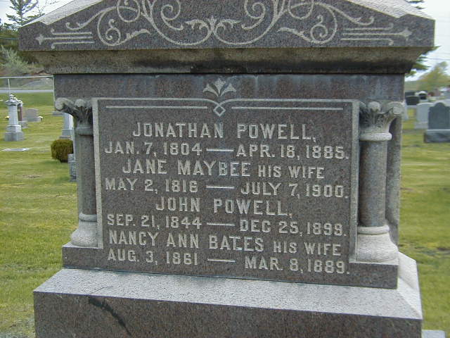 Jane Maybee was born on 2 May 1816 at Murray Twp., Northumberland Co., Upper Canada; Date May 2 1816 per Memorial. Per GEDCOM of John Maybee, May 3, 2002.1 As of 14 September 1835,her married name was Powell.2 She married Jonathan Powell, son of ? Powell and ? ?, on 14 September 1835 at Ameliasburgh Twp., Prince Edward Co., Upper Canada; Date Sep 14 1835 & location Ameliasburgh per GEDCOM of John Maybee, Jan 11, 2005.2 Jane Maybee appeared on the census of 1851 at Murray Twp., Northumberland Co., Canada west; Age 34 at 1851 Census: see Jonathan Powell.3 She appeared on the census of April 1871 at Murray Twp., Northumberland Co., Ontario; Age 54 at 1871 Census: see Jonathan Powell.4 She died on 7 July 1900 at Murray Twp., Stockdale, Northumberland Co., Ontario, at age 84; Date Jul 7 1900 per Memorial. Per GEDCOM of John Maybee, May 3, 2002.1 She was buried on 9 July 1900 at Stockdale Cemetery, Stockdale, Northumberland Co., Ontario; Memorial: (See Exhibit) Jonathan Powell; Jan 7, 1804 - Apr. 18, 1885; Jane Maybee His Wife; May 2, 1816 - July 7, 1900; John Powell; Sep 21, 1844 - Dec 25, 1899; Nancy Ann Bates His Wife; Aug 3, 1861 - Mar 8, 1889 (Stockdale Cemetery, May 21 2005.)1