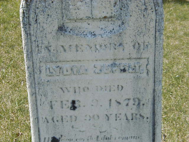Lydia Tripp was born on 3 October 1804 at Percy Twp., Northumberland Co., Upper Canada; Date Oct 3 1804 per Doug Norman's GEDCOM, May 10, 2002. Date 1805 & location Ont. per 1871 Census. Date 1804 & location Cda. per 1851 Census.1,2,3 As of 1822,her married name was Zufelt. She married Daniel Zufelt, son of Henry Zufelt and Elizabeth Young, in 1822 at Percy Twp., Northumberland Co., Upper Canada; per Doug Norman's GEDCOM, May 10, 2002. Lydia Tripp appeared on the census of 1851 at Percy Twp., Northumberland Co., Ontario; Age 47 at 1851 Census: see Adam Zufelt (son.)4 She appeared on the census of April 1871 at Percy Twp., Northumberland Co., Ontario; Age 66 at 1871 Census: see Adam Zufelt (son.)2 She died on 9 February 1879 at Percy Twp., Northumberland Co., Ontario, at age 74; Date Feb 9 1879 per Memorial. Date Feb 9 1879 per Doug Norman's GEDCOM, May 10, 2002.5,1 She was buried on 11 February 1879 at Warkworth Cemetery, Warkworth, Northumberland Co., Ontario; Memorial: (See Exhibit) In Memory Of; Lydia Zufelt; Who Died; Feb. 9, 1879; Aged 90 Years (Warkworth Cemetery, Warkworth, Apr. 28, 2007)