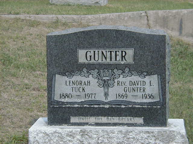 Rev. David Levi Gunter was born on 5 March 1869 at Cashel Twp., Gunter, Hastings Co., Ontario; Date Mar 5 1869 & location Gunter per Kemp GEDCOM sent to me via email by Cheryl Taber, March 14, 2006. See Marriage.1 He appeared on the census of April 1881 at Cashel & Limerick Twp., Hastings North Co., Ontario; Age 12 at 1881 Census: see Hiram Gunter.2 He married Lenorah "Nora" Tuck, daughter of Thomas "Harrison" Tuck and Margaret Ellis, on 12 August 1904 at Percy Twp., Warkworth, Northumberland Co., Ontario; Date Aug 12 1904 & location Warkworth per Kemp GEDCOM sent to me via email by Cheryl Taber, March 14, 2006. "Lenorah (1880-1977) married Rev. David Gunter (1869-1936). Both are buried at Castleton." from Oak Heights Neighbours, pg. 234.1 Rev. David Levi Gunter died on 1 March 1936 at Cramahe Twp., Castleton, Northumberland Co., Ontario, at age 66; Date Mar 1 1936 & location Castleton per Kemp GEDCOM sent to me via email by Cheryl Taber, March 14, 2006. See marriage.1 He was buried on 3 March 1936 at Castleton Cemetery, Castleton, Northumberland Co., Ontario; Memorial: (See Exhibit) GUNTER; Rev. David L. Gunter; 1869-1936; Lenorah Tuck; 1880 - 1977 (Castleton Cemetery, Castleton, Cramahe Twp.)