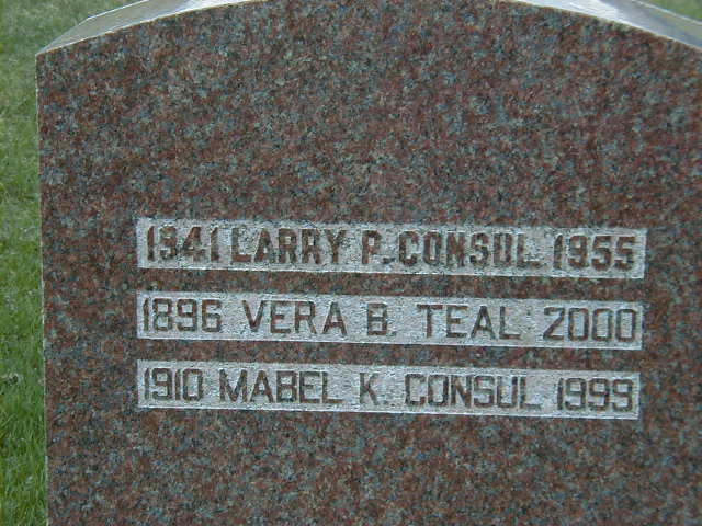 Mabel Kathleen McColl was born on 2 October 1910 at Murray Twp., Northumberland Co., Ontario; Date Oct 1910 & location Ont. per 1911 census. per The McColl Clan: Scotland to Canada, by Leona M. Austin. Date Oct 2 1910 & location Northumberland per family tree of ShelleyMoore36 on ancestry.com, June 13, 2011.2,1 She appeared on the census of 1911 at Murray Twp., Wooler, Northumberland Co., Ontario; Age 7 months at 1911 Census: see William A. McColl.2 As of before 1936,her married name was Consul. She married William John Arthur Consul, son of Parker Hiram Consul and Mary Ellen "Nellie" Bawden, before 1936 at Ontario; per family tree of ShelleyMoore36 on ancestry.com, June 13, 2011.1 Mabel Kathleen McColl died on 15 July 1999 at Trenton, Hastings Co., Ontario, at age 88; per family tree of ShelleyMoore36 on ancestry.com, June 13, 2011.1