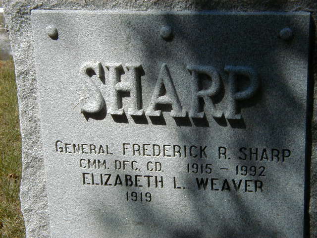 He wrote a paper for the July–August 1967 Air University Review on the Reorganization of the Canadian Armed Forces.[6]" from Wikipedia.2 He died on 10 June 1992 at Ontario at age 76; Date 1992 per Memorial. Date Jun 10 1992 per Wikipedia.2,3 He was buried on 13 June 1992 at Mount Evergreen Cemetery, Trenton, Hastings Co., Ontario; Memorial: (See Exhibit) SHARP; General Frederick R. Sharp; CMM. DFC. CD 1915 - 1992; Elizabeth L. Weaver; 1919 - (Mount Evergreen Cemetery, Trenton, Aug 28 2005.)3