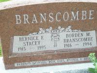 Bernice F. Stacey was born in 1915 at Ontario; Date 1915 per Memorial. per The McColl Clan: Scotland to Canada, by Leona M. Austin.1 As of before 1935,her married name was Branscombe. She married Borden M. Branscombe before 1935 at Ontario. Bernice F. Stacey was buried in 1995 at McPhail's Cemetery, Brighton Twp., Northumberland Co., Ontario; Memorial: (See Exhibit) BRANSCOMBE; Bernice F; Stacey; 1915 - 1995; Borden M; Branscombe; 1916 - 1994 (McPhail's Cemetery, Jun 30 2008.)1 She died in 1995 at Ontario; Date 1995 per Memorial.1