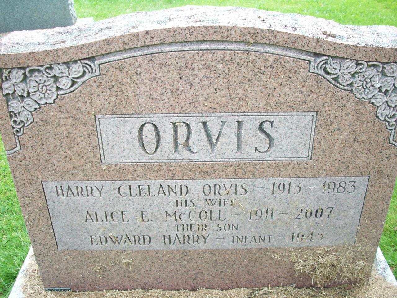 Harry Cleland Orvis was born on 2 May 1913 at Conc 2 Lot 17, Pickering Twp., Ontario Co., Ontario; Birth Reg'n.#042360: Name: Harry Cleland Orvis; Date: May 2 1913; Place: Conc 2, Lot 17, Pickering Twp; Parents: William George Orvis & Elizabeth Doan Cleland; Married: Mar 9 1910, Newmarket; Phys.: Dr. C. F. McGillivary; Inf.: W. G. Orvis, father, Pickering; Reg'd.: June 1 1913; Note: Twin #2 (Ontario Birth Registration, #042360-1913, ancestry.ca) Date 1913 per Memorial. Date 1913 & location Pickering Twp. per marriage reg'n. Date May 2 1912 & location Ont. per family tree of C Chiasson on ancestry.ca, Jun 12 2017. per The McColl Clan: Scotland to Canada, by Leona M. Austin.1,2,3,5 He lived on 4 September 1937 at 18 Stone St., Belleville, Hastings Co., Ontario; Residence 18 Stone St., Belleville per marr. reg'n.2 He married Alice Ilene "Eileen" McColl, daughter of Llewellyn Carleton "Lew" McColl and Alice May Richards, on 4 September 1937 at Wooler, Northumberland Co., Ontario; Marriage Reg'n.#: 019201: Groom: Harry Cleland Orvis; Age: 24; Res.: 18 Stone St., Belleville; Born: Pickering Twp., Ont; Status; bachelor; Occ.: Insurance Agent; Rel.: United Church; Parents: William George Orvis, Ont & Elizabeth Cleland; Bride: Alice Eileen McColl; Age: 26; Res.: 133 Bleecker Ave., Belleville; Born: Wooler; Status: spinster; Occ.: nurse; Rel.: United Church; Parents: L. C. McColl, b. Ont. & May Richards; Expected Place of Marr.: Wooler; Wit.: Howard S. Orvis, Codrington & Dorothy Haggarty; Date: Sep 4 1937; Place: Wooler; Performed by: Alfred Poulter, Wooler, United Church (2994); Sworn: Belleville, Aug 28 1937; Reg'r.: J. Wilfred Holmes, Belleville )Ontario Marriage Registration, #019201-1937, ancestry.ca.)6 Harry Cleland Orvis lived in 1974 at 229 McGill St., Peterborough, Peterborough Co., Ontario; "229 Orvis, Harry, cost clerk ... 141" & "229 Orvis, Mrs. Alice ... 142" & "229 Orvis, Roger, student ... 143" Canada Voters Lists, 1974, Peterborough, pg. 279 of 477, ancestry.ca.7 He died on 16 January 1983 at Pickering, Ontario Co., Ontario, at age 69; Date 1983 per Memorial. Date Jan 16 1983 & location Pickering per family tree of Debbi Kennedy Piech on ancestry.ca, March 21 2021.3,1 He was buried on 18 January 1983 at Wooler Friends Cemetery, Brighton Twp., Northumberland Co., Ontario; Memorial: (See Exhibit) ORVIS; Harry Cleland Orvis - 1913 - 1983; His Wife; Alice E. McColl - 1911 - 2007; Their Son; Edward Harry - infant - 1945 (Wooler Friends Cemetery, Brighton Twp., July 17 2009, by Dan.)3