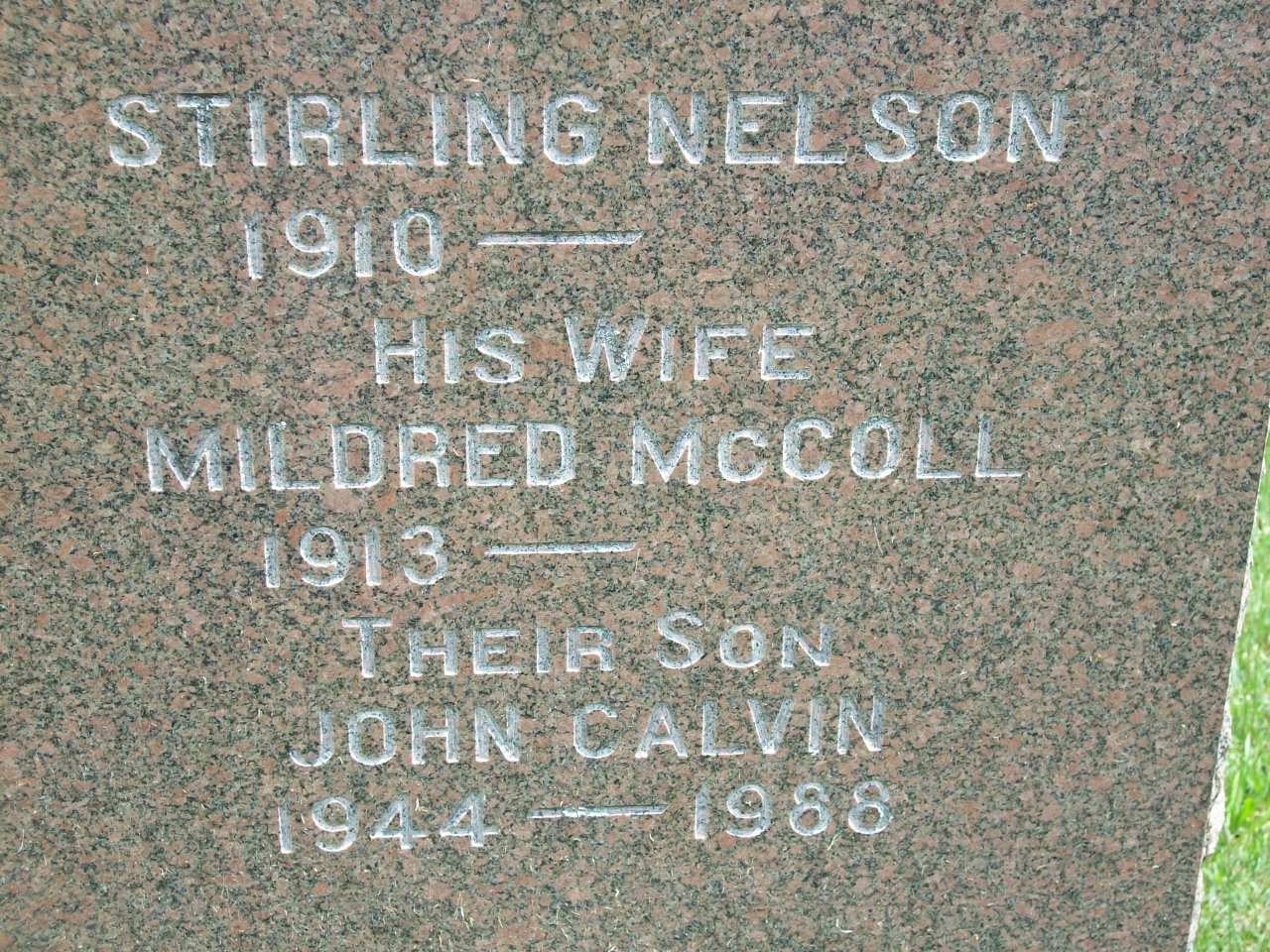 Date 1910 per Memorial. Date 1911 & location Ont. per 1921 Census. Date Aug 1910 & location Ont. per 1911 Census. Date Aug 1 1910 & location Brighton per family tree of beedunkley1 on ancestry.ca, Feb 27 2018. per The McColl Clan: Scotland to Canada, by Leona M. Austin.1,2,3,4,5 He appeared on the census of June 1911 at Brighton Twp., Orland, Northumberland Co., Ontario; Age 10 months at 1911 Census: see John Nelson (grandfather.)1 He appeared on the census of 8 June 1921 at Brighton Twp., Northumberland Co., Ontario; Age 10 at 1921 Censs: see Garret Nelson.3 He married Mildred Alida McColl, daughter of William W. "Boggie" McColl and Zella Gertrude Lapp, after 1933 at Ontario. Stirling Ward Nelson lived on 2 November 1984 at Ontario; " ... A brother, Stirling, and sister, Marion, also survive." per the Death Notice of Charlie Albert Nelson, from The Tweedsmuir Histories of Codrington, copied from microfilm at The Metro Toronto Reference Library, Nov. 2007.6 He was buried in 1994 at Wooler Friends Cemetery, Brighton Twp., Northumberland Co., Ontario; Memorial: (See Exhibit) Stirling Nelson; 1910 - ; His Wife; Mildred McColl; 1913 - ; Their Son; John Calvin; 1944 - 1988 (Wooler Friends Cemetery, Brighton Twp., June 30, 2008.)4 He died in 1994 at Ontario; Date 1994 per family tree of beedunkley1 on ancestry.ca, Feb 27 2018.4