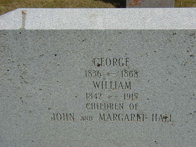 George Hall was born on 5 June 1836 at Seymour Twp., Northumberland Co., Ontario; Date 1835 & location Cda. per 1851 Census. Date Jun 5 1836 per White Family History, email Mar 26, 2002.1,2 He appeared on the census of 1852 at Seymour Twp., Northumberland Co., Ontario; Age 16 at 1851 Census: see Margaret Hall (mother.)1 He was buried in 1868 at Burnbrae Cemetery, Seymour Twp., Burnbrae, Northumberland Co., Ontario; Memorial: (See Exhibit) George; 1836 - 1868; William; 1842 - 1915; Children of; John and Margaret Hall (Burnbrae Cemetery, Seymour Twp., Aug 11 2006)
