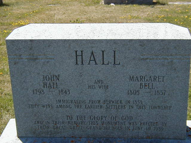 John Hall was born on 6 June 1798 at Berwick, England; Date Jun 6 1798 per White Family History, email Mar 26, 2002. Date 1798 & location Berwick, England per Memorial.2 He married Margaret Bell before 1824 at England; per memorial.2 John Hall immigrated in 1833 to Seymour Twp., Northumberland Co., Ontario; Immigration 1833 per Memorial.2 He appeared on the census of 1839 at Seymour Twp., Northumberland Co., Ontario; 1839 Census: John Hall; 4 males under 16; 1 male over 16; 2 females under 16; 1 female over 16. He was buried in 1843 at Burnbrae Cemetery, Seymour Twp., Burnbrae, Northumberland Co., Ontario; Memorial: (See Exhibit) HALL; John; Hall; 1798 - 1843; And; His wife; Margaret; Bell; 1805 - 1857; Immigrating from Berwick in 1833; They were among the early settlers in this township; To the Glory of God; And in their memory, This monument was erected by; Their Great Great Grandchildren in June of 1989 (Burnbrae Cemetery, Seymour Twp., Aug 11 2006.)2 He died in 1843 at Seymour Twp., Northumberland Co., Ontario; Date 1843 per Memorial.2