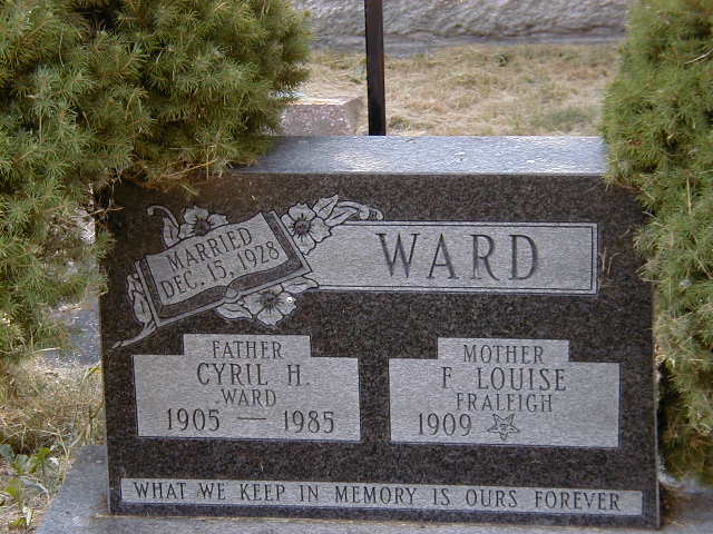 Cyril H. Ward was born in 1905; Date 1905 per Memorial. per GEDCOM of Meredith Mullett-Bulloch, July 30, 2002.1 He was buried in 1985 at Hixsite Friends Cemetery, Bloomfield, Prince Edward Co., Ontario; Memorial: (See Exhibit) WARD; Father; Cyril H; Ward; 1905 - 1985; Mother; E. Louise; Fraliegh; 1909 - (Hixsite Friends Cemetery, Bloomfield, Prince Edward Co., June 11, 2006.)1 He died in 1985 at Ontario; Date 1985 per Memorial.1