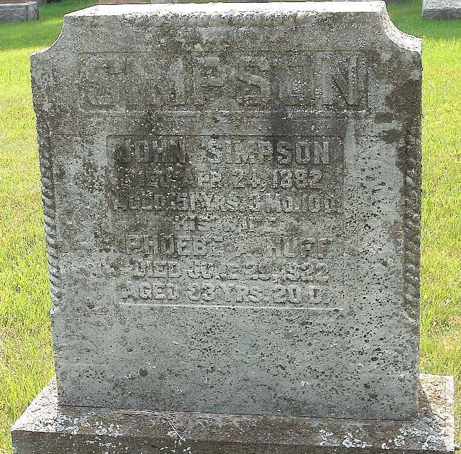 CEMSearch: Name: John Simpson; Born: - ; Died: 1882-04-24; Age: 51y 3m 10d; Notes: Husband of Phoebe A. Huff; Buried: Woods Cemetery; Other names: Phoebe A. Simpson (Huff) ( -1922.)7