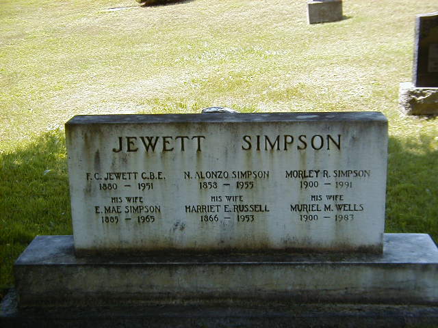Note: This would later be Dorman St. North and Cheer Dr.11 He Alonzo Simpson appears in The Latimer Photos which were taken by Hugh Latimer during the early 1920s and late 1930s at his father's General Store in Orland. (The Latimer Photos, Codrington Public Library) circa 1930 at Brighton Twp., Orland, Northumberland Co., Ontario.13 He died in 1955 at Ontario; Date 1955 per Burial.1 He was buried in 1955 at Mount Hope Cemetery, Brighton, Northumberland Co., Ontario; Memorial: (See Exhibit) JEWETT - SIMPSON; F. C. Jewett, C.B.E; 1880 - 1951; His Wife; E. Mae Simpson; 1885 - 1965; N. Alonzo Simpson; 1858 - 1955; His Wife; Harriet E. Russell; 1866 - 1953; Morley R. Simpson; 1900 - 1991; His Wife; Muriel M. Wells; 1900 - 1983 (Mount Hope Cemetery, Brighton, July 10, 2004.)1