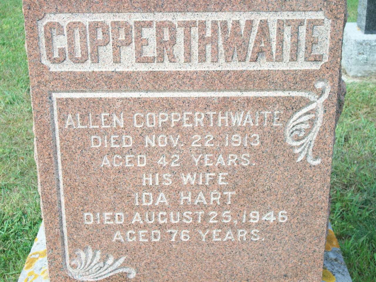 Ida Hart was born in 1870 at Haldimand Twp., Northumberland Co., Ontario; Date 1870 per Memorial. per GEDCOM of Edward Ufford, Sep 16, 2002.1,2 She appeared on the census of April 1891 at Belmont Twp., Peterborough Co., Ontario; Age 19 at 1891 Census: see Freman Hart.3 As of 14 March 1894,her married name was Copperthwaite. She married Allen Copperthwaite on 14 March 1894 at Ontario; per Memorial.2 Ida Hart died on 25 August 1946 at Ontario; Date Aug 25 1946 per Memorial. per GEDCOM of Edward Ufford, Sep 16, 2002.2 She was buried on 27 August 1946 at Maple Grove Cemetery, Belmont Twp., Peterborough Co., Ontario; Memorial: (See Exhibit) COPPERTHWAITE; Allen Copperthwaite; Died Nov 22, 1913; Aged 42 Years; His Wife; Ida Hart; Died August 25, 1946; Aged 76 Years (Maple Grove Cemetery, Belmont Twp., Sep 7 2008.)2
