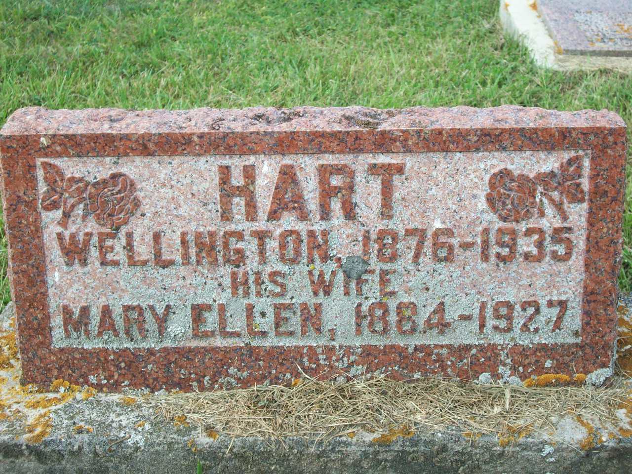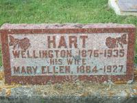 Date 1876 per Memorial. Date per 1901 Census. per GEDCOM of Edward Ufford, Sep 16, 2002. Date 1878 & location Castleton per marr. reg'n.1,2,3,4 He appeared on the census of April 1891 at Belmont Twp., Peterborough Co., Ontario; Age 16 at 1891 Census: see Freeman Hart.5 He appeared on the census of 13 April 1901 at Belmont Twp., Peterborough Co., Ontario; Age 24 at 1901 Census: see Freeman Hart.6 He lived on 28 April 1902 at Havelock, Peterborough Co., Ontario; Residence Havelock per marr. reg'n.2 He married Mary Ellen "Nellie" Keiting, daughter of James Keiting and Hannah Parsons, on 28 April 1902 at Belleville, Hastings Co., Ontario; Marriage Reg'n.#008338: Groom: Wellington Hart; Age: 24; REs.: Havelock; Born: Castleton; Status: bachelor; Occ.: farmer; Parents: Freeman Hart & Jane Masters; Bride: Nellie Katin; Age: 20; Res.: - ; Born: Belmont; Status: spinster; Parents: James Katin & Hannah Parsons; Wit.: Wm. Copperthwaite, Trenton & B .Locke, Belleville; Date: Apr 28 1902; Place: Belleville; Rel.: Meth; Performed by: Jos. H. Locke; reg'd.: Apr 29 1902; reg'r.: D. N, Robertson (Ontario Marriage Registration, #008338-1902, ancestry.com.)7 Wellington Hart appeared on the census of 1911 at Belmont & Methuen Twp.'s, Cordova Village, Peterborough Co., Ontario; Age 34 at 1911 Census: Hart, Wellington, 34, b. Ont. Nov 1877, Irish, Meth., farmer, married; Nellie, 25, b. Ont. Sep 1984, Irish, Meth., married; Violet, 9, b. Ont. Oct 1903, daughter; Eva, 6, b. Ont. Jan 1904, daughter; Fredia, 4, b. Ont. Mar 1906, daughter; Bernice, 3, b. Ont. Mar 1907, daughter; Margery, 2, b. Ont. Feb 1909, daughter; Roy, - , b. Ont. May 1911, son (1911 Census Online: Belmont & Methuen Twp.'s, dist. 112, sub-dist. 9, pg. 7, line 37 - Conc 4, Lot 24.)8 He lived in 1911 at Conc 4 Lot 24, Belmont Twp., Cordova Village, Peterborough Co., Ontario; Residence per 1911 Census: Conc 4, Lot 24, Belmont Twp. - Cordova Village.8 He was buried in 1935 at Maple Grove Cemetery, Belmont Twp., Peterborough Co., Ontario; Memorial: (See Exhibit) HART; Wellington, 1876 - 1935; His Wife; Mary Ellen, 1884 - 1927 (Maple Grove Cemetery, Belmont Twp., Sep 7 2008.)1 He died in 1935; Date 1935 per Memorial. per GEDCOM of Edward Ufford, Sep 16, 2002.1