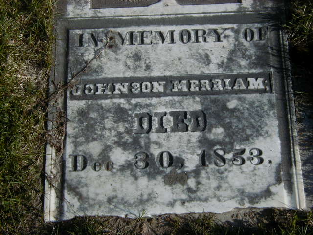 Johnson M. Merriam was born on 30 July 1788 at Wallingford, New Haven, Connecticut, U.S.A; per GEDCOM of Elizabeth Archer, Sep 22, 2002. He appeared on the census of 1810 at Haldimand Twp., Northumberland Co., Ontario; 1810 Census: Johnson Merriman; 1 male 16 to 60. He married Elizabeth "Betsey" Massey, daughter of Daniel Massey and Rebecca Kelley, on 10 November 1810 at Haldimand Twp., Northumberland Co., Ontario; per GEDCOM of Elizabeth Archer, Sep 22, 2002. Johnson M. Merriam appeared on the census of 1812 at Haldimand Twp., Northumberland Co., Ontario; 1812 Census: Johnson Merriman; 1 male over 16; 1 female over 16; 1 female under 16; Total 3. He appeared on the census of 1813 at Haldimand Twp., Northumberland Co., Ontario; 1813 Census: Johnson Merriman; 1 male over 16; 1 female over 16; 1 female under 16; Total 3. He appeared on the census of 1815 at Haldimand Twp., Northumberland Co., Ontario; 1815 Census: Johnson Merriman; 1 male over 16; 1 female over 16; 2 males under 16; Total 4. He appeared on the census of 1817 at Haldimand Twp., Northumberland Co., Ontario; 1817 Census: Johnson Merriman; 1 male over 16; 1 female over 16; 1 male under 16; 2 females under 16; Total 5. He appeared on the census of 1818 at Haldimand Twp., Northumberland Co., Ontario; 1818 Census: Johnson Merriman; 1 male over 16; 1 female over 16; 1 male under 16; 3 females under 16; Total 6. He appeared on the census of 1822 at Haldimand Twp., Northumberland Co., Ontario; 1822 Census: Johnson Merriman; 1 male 16 to 60; 1 female 16 to 60; 1 male under 16; 2 females under 16; Total 5. He appeared on the census of 1823 at Haldimand Twp., Northumberland Co., Ontario; 1823 Census: Johnson Merriman; 1 male 16 to 60; 1 female 16 to 60; 1 male under 16; 3 females under 16; Total 6. He appeared on the census of 1825 at Conc 2 Lot 27, Haldimand Twp., Northumberland Co., Ontario; 1825 Census: Johnson Merriam; 1 male under 16; 3 females under 16; 1 male over 16; 1 female over 16; Total 6. He appeared on the census of 1850 at Conc 2 Lot 27, Haldimand Twp., Northumberland Co., Ontario; 1850 Census: Johnson Merriam; Conc 2, Lot 27, occupied, non-prop; Total Persons - 4. He died on 30 December 1853 at Haldimand Twp., Northumberland Co., Ontario, at age 65; Date Dec 30 1853 per Memorial. Date Dec 30 per GEDCOM of Elizabeth Archer, Sep 22, 2002.1,2 He was buried on 1 January 1854 at Academy Hill Cemetery, Haldimand Twp., Northumberland Co., Ontario; Memorial: (See Exhibit) In Memory of; Johnson Merriam; Died; Dec 30 1853 (Academy Hill Cemetery, Haldimand Twp., apr 28 2007.)1