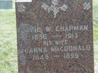"DIED; Chapman. In Kingston, on Friday, July 31st, 1914, David W. Chapman, aged 79 years. The funeral service was held in the Presbyterian church, Brighton, on Monday, Aug. 3rd, and interment took place at Mount Hope cemetery." from pg. 015 of Newspaper Clippings, a collection donated by Shawnee Spencer to the Brighton Digital Archives, 2022.13,14,15 He was buried on 3 August 1914 at Mount Hope Cemetery, Brighton, Northumberland Co., Ontario; Memorial: (See Exhibit) David W. Chapman; 1836 - 1913; His Wife; Joanna MacDonald; 1845 - 1899 (Mount Hope Cemetery, Brighton, July 10, 2004)
