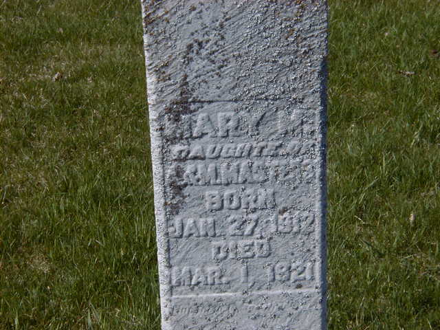 Mary Mildred Masters was born on 27 January 1912 at Brighton Twp., Northumberland Co., Ontario; Date Jan 27 1912 & location Brighton Twp. per Death Reg'n. Date Jan 27 1912 per Memorial & CEMSearch. Date Feb 27 1912 per GEDCOM of Karen Black, Nov 15, 2002.2,3,4,1 She died on 1 March 1921 at Brighton Twp., Northumberland Co., Ontario, at age 9; Death Reg'n.#023623: Name: Mary Mildred Masters; Date: Mar 1 1921; Age: 9y 4m 1d; Res.: Brighton Twp., Conc 4, Lot 24; Born: Brighton Twp., Jan 27 1912; Parents: Arnold Masters, b. Haldimand & Minnie Bell, Brighton Twp; Inf.: Arnoldi Masters, Wooler, father; Burial: Friends Cemetery, Mar 3 1921; Phys.: Dr. J. S. Anderson, Wooler; Reg'd.: Mar 3 1921 (Ontario Death Registration, #023623-1921, ancestry.com)