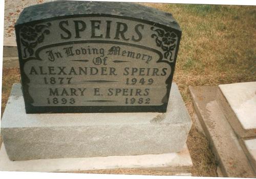 Date Oct 20 1879 & location Ont. rural per 1901 Census. Date 1878 & location Ont. per 1881 Census.3 He appeared on the census of April 1881 at Otonabee Twp., Peterborough Co., Ontario; Age 3 at 1881 Census: see Alexander Speirs.4 He appeared on the census of April 1901 at Otonabee Twp., Peterborough Co., Ontario; Age 23 at 1901 Census: see Alexander Speirs.5 He married Mary E. ? circa 1915 at Saskatchewan; per Memorial.2 William "Alexander" Speirs was buried in 1949 at Hillcrest Cemetery, Shaunavon, Saskatachewan; Memorial: (See Exhibit) SPEIRS; In Loving Memory; of; Alexander Speirs; 1877 - 1949; Mary E. Speirs; 1893 - 1982 (Hillcrest Cemetery, Shaunavon, Saskatchewan - image sent to me by Nora Redpath, June 8, 2008.)2,6 He died in 1949 at Shaunavon, Saskatchewan; Date 1949 per Memorial.2