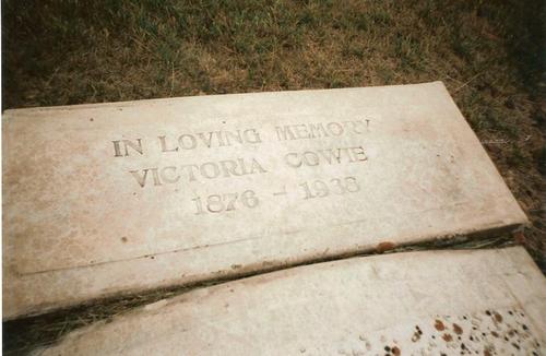 Date 1938 per Memorial.5,3 She was buried on 8 July 1968 at Hillcrest Cemetery, Shaunavon, Saskatchewan; Memorial: (See Exhibit) In Loving Memory; Victoria Cowie; 1876 - 1968 (Hillcrest Cemetery, Shaunavon, Saskatchewan - image sent to me by Nora Redpath, June 8, 2008.)5,3