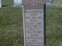 per email from Bill Mills, Sept. 17, 2003.1,8 He was buried on 1 January 1915 at Stone's Cemetery, Percy Twp., Northumberland Co., Ontario; Memorial: (See Exhibit) Wm. Evans, Sr; Died; Dec. 30, 1914; Aged; 82 Ys, 5 Ms; Elizabeth; Wife of; Wm. Evans; Born: Sept. 13, 1823; Died; April 8, 1900 (Stone's Cemetery, Percy Twp., June 25 2007.)4