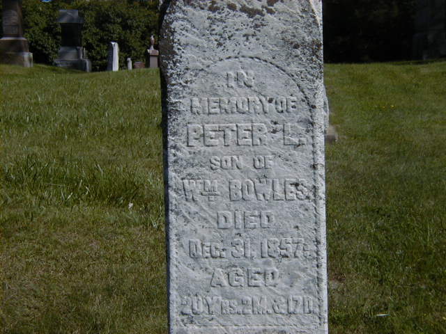 CEMSearch shows: Name: Peter L. Bowles; Born: 1837-10-14; Died: 1857-12-31; Age: 20y 2m 17d; Notes: son of William Bowles; Buried: Mount Hope Cemetery, Brighton; Other names: Laura Bowles (Waldron) ( -1883), Robert J. Bowles (1848-1898), William Bowles ( -1879.)2,1
