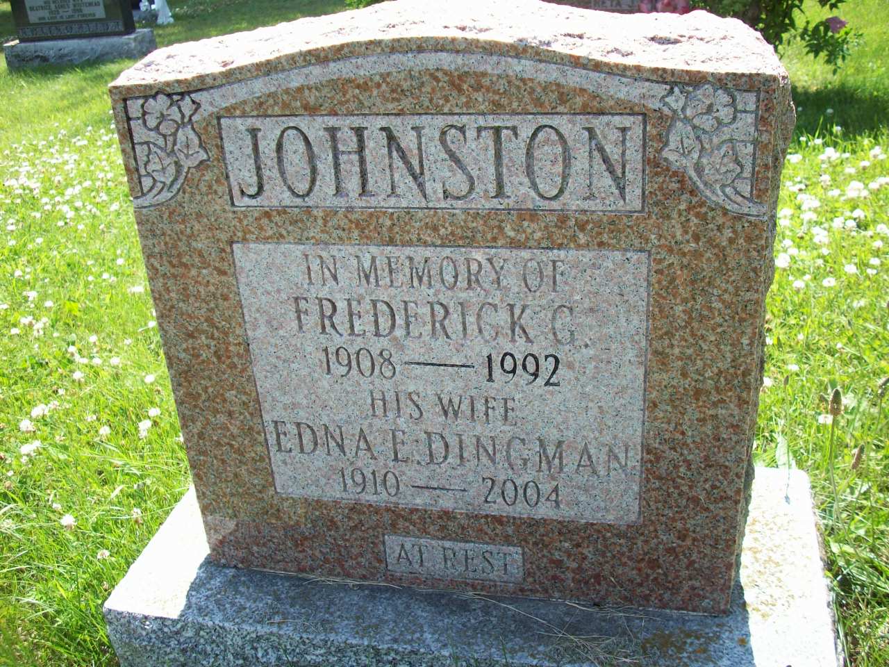 Frederick G. Johnston was born on 11 December 1909 at Ireland; Date Dec 11 1909 & location Ireland per email from Gwen (Dingman) Wybenga, Feb 16 2007. Date 1908 per Burial.1,2 He married Edna Eileen Dingman, daughter of Edward Erwin Dingman and Gertrude May Andrus, on 11 February 1931 at Ontario; per email from Gwen (Dingman) Wybenga, Feb 16 2007.1,2 Frederick G. Johnston died on 25 December 1992 at Port Hope, Ontario, at age 83; Date Dec 25 1992 & location Port Hope per email from Gwen (Dingman) Wybenga, Feb 16 2007. Date 1908 per Burial.1,2 He was buried on 28 December 1992 at Castleton Cemetery, Castleton, Northumberland Co., Ontario; Memorial: (see Exhibit) Johnston; In Memory of; Frederick G; 1908 - 1992; His Wife; Edna E. Dingman; 1910 - 2004 (Castleton Cemetery, Castleton, Jul 13 2009.)1,2)
