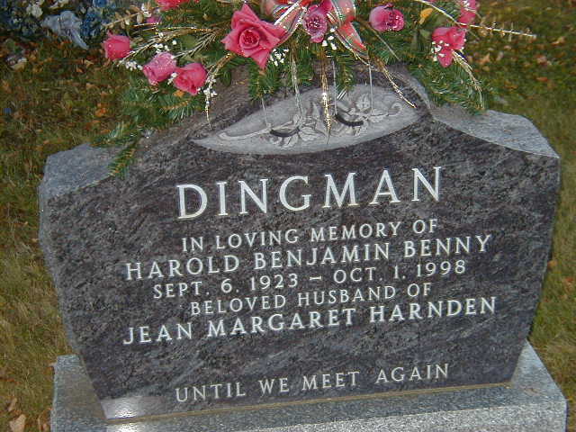 Harold Benjamin "Benny" Dingman was born on 6 September 1923 at Cramahe Twp., Northumberland Co., Ontario; Date Sep 6 1923 per Burial. Date Sep 6 1923 per "Family of Samuel Dingman of Cramahe", sent to me by Richard Hughes, Sept. 11, 2003. Per Burial.1,2 He died on 1 October 1998 at Northumberland Co., Ontario, at age 75; Datge Oct 1 1998 per Burial.1,2 He was buried on 4 October 1998 at Salem Cemetery, Cramahe Twp., Salem, Northumberland Co., Ontario; Memorial: (See Exhibit) DINGMAN; In Loving Memory of; Harold Benjamin Dingman; Sept. 6, 1923 - Oct. 1, 1998; Beloved Husband of; Jean Margaret Harnden (Salem Cemetery, Sep 24, 2004)