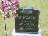 Harry Edward Dingman was born on 2 March 1918 at Cramahe Twp., Northumberland Co., Ontario; Date 1918 & location Ont. per 1921 Census. "Birth: A son, to Mrs. Edward Dingman, Mar 2, 1918" from The Brighton Ensign, Mar 15 1918, seen on microfilm at The Trenton Public Library, May 28, 2002.1,3,4 He appeared on the census of 6 June 1921 at Cramahe Twp., Northumberland Co., Ontario; Age 3 at 1921 Census: see Henry R. Dingman (grandfather.)4 He married Elda M. Lindle, daughter of William Benjamin Lindle and Violet Ellen Hannah, on 17 April 1943 at Northumberland Co., Ontario; Date Apr 17 1943 per Burial.1 Harry Edward Dingman lived on 17 September 1960 at Castleton, Northumberland Co., Ontario; Residence per marriage notice of daughter Madeline Dale Dingman.3 He lived in October 1976 at R. R. 2, Castleton, Northumberland Co., Ontario; Residence per marriage notice of daughter Dianne Elizabeth Dingman.3 He died on 12 March 1999 at Cramahe Twp., Northumberland Co., Ontario, at age 81; Date 1999 per Memorial. Date Mar 12 1999 per CemSearch.1,2 He was buried on 14 March 1999 at Castleton Cemetery, Castleton, Northumberland Co., Ontario; Memorial: (see Exhibit) Dingman; Harry E. Dingman; 1918 - 1999; His Loving Wife; Elda M; 1922 - 2001; Married Apr 17 1943 (Castleton Cemetery)