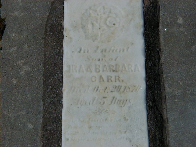 ? Carr was born on 15 October 1870 at Cramahe Twp., Northumberland Co., Ontario.1 He died on 20 October 1870 at Cramahe Twp., Northumblerland Co., Ontario.1 He was buried on 22 October 1870 at Carrs Cemetery, Cramahe Twp., Northumberland Co., Ontario; Memorial: (see Exhibit) In Infant; son of; Ira & Barbara Carr; Died Oct 20 1870; Aged 5 days (Carrs Cemetery, May 2, 2003.)1