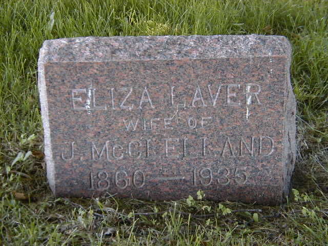 Eliza A. Laver was born on 6 July 1860 at Percy Twp., Norham, Northumberland Co., Canada West; Date 1860 per Memorial. Date Jul 6 1860 & location Ont. rural per 1901 Census. Date 1860 & location Ont. per 1871 Census. Date Jul 6 1860 per GEDCOM of lbremner@sprint.ca, May 13, 2003.1,2,3,4 She appeared on the census of April 1871 at Percy Twp., Northumberland Co., Ontario; Age 11 at 1871 Census: see Adam Laver.2 As of 18 June 1889,her married name was McClelland.1 She married James Lofhus McClelland, son of William McClelland and Mary Jane Reddick, on 18 June 1889 at Percy Twp., Warkworth, Northumberland Co., Ontario; Marriage Reg'n.#008933: Groom: James L. McClelland; Age: 35; Res.: Norham; Born: Cramahe; Status: widower; Occ.: Farmer; Parents: William & Mary McClelland; Bride: Eliza Laver; Age: 27; Res. & Born: Norham; Status: Spinster; Parents: ADam & Elizabeth Laver; Wit.: J. E. Thompson, Warkworth; Date: Jun 18 1889; Place: Warkworth; Rel.: Episc. & Meth; Performed by; Rev. C. S. Thompson, Pastor C. M. Church, Warkworth; Reg'r.: R. P. Hurlbut, Percy Twp. (Ontario Marriage Registration, #008933-1889, ancestry.com) Date JUn 18 1889 & location Warkworth per GEDCOM of lbremner@sprint.ca, May 13, 2003.1,5 Eliza A. Laver appeared on the census of April 1901 at Cramahe Twp., Northumberland Co., Ontario; Age 40 at 1901 Census: see James McClelland.4 She died on 29 November 1935 at Ontgario Hospital, Toronto, York Co., Ontario, at age 75; Death Reg'n.#039941: Name: Eliza McClelland; Date: Nov 29 1935; Age: 75y 4m 23d; Place: Ontario Hospital, Toronto; Res.: Norham; Born: Ont., Jul 6 1860; Status: widow, wife of late James McClelland; Parents: Adam Laver & Elizabeth Sperring, b. England; Inf.: Mrs. Geo. Evans, Norham, sister; Burial: Stone Cemetery, Dec 2 1935; Und.: B. Buchanan, Warkworth; Reg'd.: Dec 4 1935; Reg'r.: T. R. Langstaff (Ontario Death Registration, #039941-1935, ancestry.com) Date 1935 per Memorial. per GEDCOM of lbremner@sprint.ca, May 13, 2003.1,3,6 She was buried on 2 December 1935 at Stone's Cemetery, Percy Twp., Northumberland Co., Ontario; Memorial: (See Exhibit) Eliza Laver; wife of; J. McLelland; 1860 - 1935 (Stone's Cemetery, Percy Twp., June 25 2007) per Death Reg'n. per GEDCOM of lbremner@sprint.ca, May 13, 2003.1,3,7