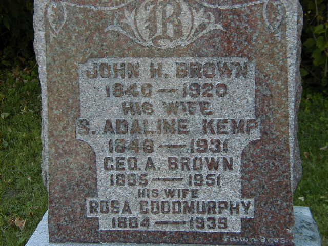 George Alton Brown was born on 17 May 1885 at Ameliasburg Twp., Prince Edward Co., Ontario; Date 1885 per Memorial. Date May 17 1885 & location Cda. per FindaGrave. Date 1885 & location Ont. per 1921 Census. Date May 17 1886 per 1901 Census. Date 1886 & location Ont. per 1891 Census. Date 1886 & location Ameliasburgh per marr. reg'n.1,2,5,3,4,6 He appeared on the census of April 1891 at Ameliasburgh Twp., Prince Edward Co., Ontario; Age 5 at 1891 Census: see John H. Brown.5 He appeared on the census of April 1901 at Ameliasburgh Twp., Prince Edward Co., Ontario; Age 14 at 1901 Census: see John H. Brown.1 He lived on 10 April 1907 at Ameliasburgh Twp., Prince Edward Co., Ontario; Residence Ameliasburgh per marr. reg'n.2 He married Roseanna Goodmurphy, daughter of Gilbert Goodmurphy and Sophronia Elwilda Nix, on 10 April 1907 at Ameliasburgh Twp., Prince Edward Co., Ontario; Marriage Reg'n.#018034-1907: Groom: George Alton Brown; Age: 21; Res. & Born: Ameliasburgh; Status: bachelor; Occ.: farmer; Rel.: Meth; Parents: John H. Brown & Adeline Kemp; Bride: Rosanna Goodmurphy; Age: 23; Res. & Born: Ameliasburgh; Status: spinster; Rel.: Meth; Parents: Gilbert Goodmurphy & Sophian Nix; Wit.: Louis Goodmurphy & Hattie Brown, Ameliasburgh; Date: Apr 10 1907; Place: Ameliasburgh; Performed by: Rev. Joseph M. Whyte; Reg'd.: Apr 10 1907; Reg'r.: James Benson, Ameliasburgh (Ontario Marriage Registratin, #018034-1907, ancestry.com) per Memorial.3,7 George Alton Brown lived on 9 December 1920 at Lot 11, East CP, Ameliasburgh Twp., Carrying Place, Prince Edward Co., Ontario; Land Registry Records (Will ?1516? G.R.) show that John Harvey Brown willed to George Alton Brown part of lot 11, "subject to a life interest or until she marries again of Sarah Adaline Brown", East of Carrying Place, Ameliasburgh Twp., Prince Edward Co. ITS Date: Jun 1 1910. Reg'n. Date: Dec 9 1920. (Ontario Land Registry Records, Prince Edward Co., Amelaisburgh Twp., Book 13, Easterly side of Carrying Place, Lot 11, pg 261 of 350, pg 2, copied by Dan from OnLand.ca Mar 2 2022.)8 He appeared on the census of 18 June 1921 at Ameliasburgh Twp., Prince Edward Co., Ontario; Age 36 at 1921 Census: Brown. Geo., 36, b. Ont., p.b. Ont., Eng., Meth., farmer, married; Rosanna, 37, b. Ont., p.b. Ont., Irish, Meth., married; Harry, 2; Wesley, 17, b. Ont., p.b. Cda., Eng., Meth., lab., lodger, single (1921 Census: Ameliasburgh Twp., Prince Edward Co., dist. 122, sub-dist. 2, pg. 18, line 30 - ancestry.ca.)6 He lived on 28 June 1947 at Lot 11, East CP, Ameliasburgh Twp., Carrying Place, Prince Edward Co., Ontario; Land Registry Records (Grant 11825) show that George Alton Brown, widower, sold part of lot 11, East of Carrying Place, Ameliasburgh Twp., Prince Edward Co. to Charles William Bird. ITS Date: Jun 28 1947. Reg'n. Date: Aug 29 1947. (Ontario Land Registry Records, Prince Edward Co., Amelaisburgh Twp., Book 13, Easterly side of Carrying Place, Lot 11, pg 262 of 350, pg 3, copied by Dan from OnLand.ca Mar 2 2022.)8 He died in 1951; Date 1951 per Memorial.3 He was buried in 1951 at Albury Cemetery, Albury, Prince Edward Co., Ontario; Memorial: (See Exhibit) John H. Brown; 1840 - 1920; His Wife; S. Adaline Kemp; 1848 - 1931; Geo. A. Brown; 1885 - 1951; Rosa Goodmurphy; 1884 - 1939 ( Albury Cemetery, Ameliasburgh Twp., Jul 11 2004)