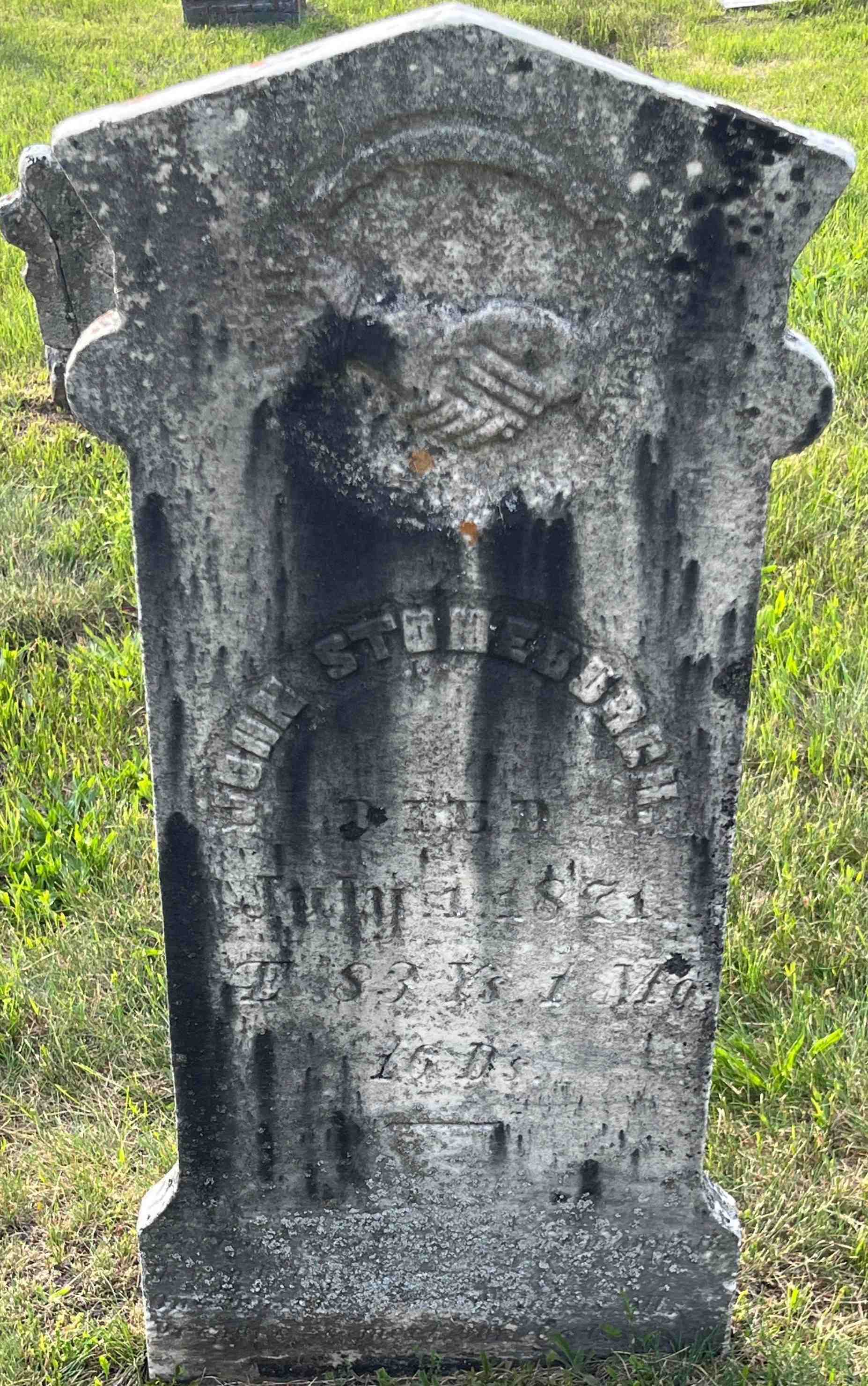 John Stoneburgh was born on 15 June 1788 at Nova Scotia; Date May 15 1788 per Memorial - age 83y 1m 16d at death July 1 1871. Date Jun 15 1788 & location Prince Edward Co., Ont. per FindaGrave. Date 1789 & location N.S. per 1871 Census. Location N.S. per 1891 Census - daughter Elizabeth Jane (Stoneburgh) Covell. Date 1786 & location CW per 1861 Census. Date 1787 & location Cda. per 1851 Census. Date 1788 & location Weller's Bay per GEDCOM of Kathy Nelzen, Apr 5, 2004.1,3,4,5,2,6,7 He married Eva Olive Mikel, daughter of Godlove Mikel and Elizabeth Lott, in 1816 at Murray Twp., Weller's Bay, Northumberland Co., Upper Canada; Date 1816 per GEDCOM of Paul Enge, June 24, 2004. per GEDCOM of Kathy Nelzen, Apr 5, 2004.1 John Stoneburgh lived in 1822 at Prince Edward Co., Upper Canada; Militia Return: Name: John Stonebugh; Age: 35 (Ontario Registers CD.)8 He lived on 2 February 1823 at Lot 1, South East of Carrying Place, Ameliasburgh Twp., Prince Edward Co., Upper Canada; Land Registry Records (B&S ?1121?) show that James ?Young? sold 60 acres in the south part of lot 1, South East of Carrying Place, Ameliasburgh Twp., Prince Edward Co. to John Stoneburgh. ITS Date: Feb 2 1823?. Reg'n. Date: ?Jul? 19 1823. (Ontario Land Registry Records, Prince Edward Co., Ameliasburgh Twp., Carrying Place Lots, Book 13, pg 002 of 340, pg. 1, page copied from OnLand.ca by Dan March 3 2022.)9 He appeared on the census of 1851 at Ameliasburgh Twp., Prince Edward Co., Canada West; age 64 at 1851 Census: Stoneburgh, John, 64, b. Cda., Pres., Carpenter, married; Eva, 54, b. Cda., WM, married; Nancy J., 19, b. Cda., WM, dau; Wm. A.(m), 16; Chas. M., 13; Dan'l S., 11 (1851 Census: Ameliasburgh Twp., Prince Edward Co., pg. 73 of 94, line 8, ancestry.ca.)6 He appeared on the census of April 1861 at Ameliasburgh Twp., Prince Edward Co., Canada West; Age 75 at 1861 Census: Stoneburgh, John, 75, b. CW, Occ: farmer; Rel.: Epsisc. ... (1861 Census: Ameliasburgh Twp., Prince Edward Co., Dist. 2, page 28, ancestry.ca)