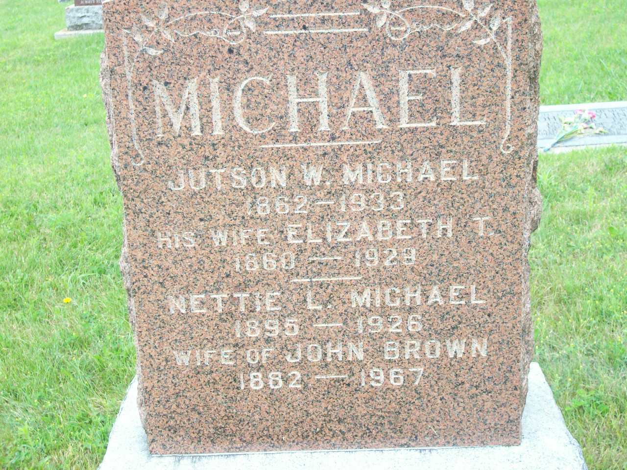 Date 1882 per Memorial. Date 1886 & location Ont. per 1921 Census. Date 1882 & location Ont. per 1891 Census. Date 1884 & location Ameliasburgh Twp. per marr. reg'n.1,2,4,5,6 He appeared on the census of April 1891 at Ameliasburgh Twp., Prince Edward Co., Ontario; Age 9 at 1891 Census: see Andrew Brown.1 He lived on 9 May 1917 at Ameliasburgh Twp., Prince Edward Co., Ontario; Residence Ameliasburgh Twp. per marr. reg'n.2 He married Annette Lucretia "Nettie" Michael, daughter of Jutson Wade Michael and Elizabeth Tucker "Lizzie" Fiddick, on 9 May 1917 at Brighton, Northumberland Co., Ontario; Marriage Reg'n.#014124: Groom: John Andrew Brown; Age: 33; Res. & Born: Ameliasburgh Twp; Status: bachelor; Occ.: farmer; Rel.: Meth; Parents: Andrew Brown & Camella Walt; Bride: Nettie Lucretia Michael; Age: 22; Res.: Brighton; Born: Brighton Twp; Status: spinster; Rel.: Meth; Parents: Judson Wade Michael & Elizabeth Fiddick; Expected Res.: Brighton; Wit.: Norman A. Alyea, Colborne & Grace M. McDonald, Dundonald; Date: May 9 1917; Place: Brighton; Performed by: Wesley ?Ellice?, Brighton, Meth; Sworn: Trenton, May 4 1917; Reg'r.: T. F. Rixon, Trenton (Ontario Marriage Registration, #014124-1917, ancestry.ca.)7 John Andrew Brown appeared on the census of 18 June 1921 at Brighton Twp., Northumberland Co., Ontario; Age 35 at 1921 Census: Brown, John A., 35, b. Ont., p.b. Ont., Eng., Meth., farmer, married; Nettie L., 25, b. Ont., p.b. Ont., Eng., Dutch, Meth., married; Norman, 3; Marjorie, 1 (1921 Census: Brighton Twp., Northumberland Co., dist. 107, sub-dist. 2, pg. 8, line 16 - ancestry.ca.)6 He lived on 26 January 1926 at Brighton Twp., Northumberland Co., Ontario; Informant for Death Reg'n. of wife Annette Lucretia "Nettie" (Michael) Brown.8 He lived in 1935 at R. R. # 4, Brighton, Northumberland Co., Ontario; "65 Brown, John A., farmer, R.R. 4, Brighton" Canada Voters Lists, 1935, Northumberland Co., Brighton Twp., pg. 59 of 126, ancestry.ca.9 He died on 11 July 1967 at Trenton, Hastings Co., Ontario, at age 84; Date 1967 per Memorial. Date Jul 11 1967 & location Trenton per family tree of lindacookie on ancestry.ca, Nov 2 2023.4,10 He was buried on 13 July 1967 at Woods Cemetery, Cramahe Twp., Northumberland Co., Ontario; Memorial: (See Exhibit) MICHAEL; Jutson W. Michael; 1862 - 1933; His Wife Elizabeth T; 1860 - 1929; Nettie L. Michael; 1895 - 1926; Wife of John Brown; 1882 - 1967 (Woods Cemetery, Cramahe Twp., July 6, 2009)