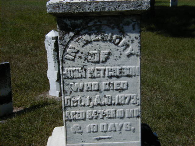 Date Nov 11 1788 per IGI Record.1,2,3 He married Letitia Calverley before 1808 at Upper Canada; per birth date of daughter Maria.1,2 John Ketcheson lived on 8 February 1820 at Conc 5 Lot 24, Sidney Twp., Hastings Co., Upper Canada; Land Registry Records (B.S. D330) show that John Bickham, ehir at law for the late Robert Bickham sold all 200 acres of lot 24, conc 5, Sidney Twp. to John Ketcheson. ITS Date: Feb 8 1820. Reg'n. Date: - . (Ontario Land Registry Records, Hastings Co., Sidney Twp., Book 378, Pg. 034 of 325, Conc 5, Lot 24, image copied from OnLand.ca by Dan Buchanan, Aug 15 2022.)4 He died on 1 October 1873 at Hastings Co., Ontario, at age 84; Date Oct 1 1873 per Memorial. per IGI Record.1,2 He was buried on 3 October 1873 at Longwell Cemetery, Sidney Twp., Hastings Co., Ontario; Memorial: (See Exhibit) In Memory of; John Ketcheson; Who Died; Oct. 1, A.D. 1873; Aged 84 Y'rs 10 Mo; & 19 Days (Longwell Cemetery, Sidney Twp., June 22, 2006.)2