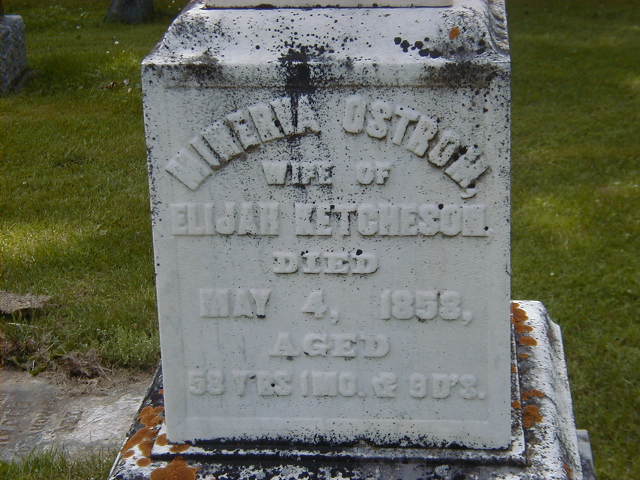 Minerva Jane Ostrom was born in Sidney Twp., Hastings Co., ON and not Sydney, NS. I have found no trace that the Ostroms were ever on the east coast." per email from Sandra (Bellyou) Horwat of Brighton, Dec 31 2010.1,2,3 As of 19 May 1819,her married name was Ketcheson.1 She married Elijah Ketcheson, son of William Ketcheson and Mary Rull, on 19 May 1819 at Upper Canada; per IGI Record.1 Martha Minerva Jane Ostrom died on 4 May 1858 at Belleville, Hastings Co., Ontario, at age 58; DAte May 4 1858 per Memorial. per IGI Record.1,2 She was buried on 6 May 1858 at Belleville Cemetery, Belleville, Hastings Co., Ontario; Memorial: (See Exhibit) Minerva Ostrom; Wife of; Elijah Ketcheson; Died; May 4, 1858; Aged; 58 Y's 1 Mo. & 9 D's (Belleville Cemetery, Belleville, June 22, 2006)