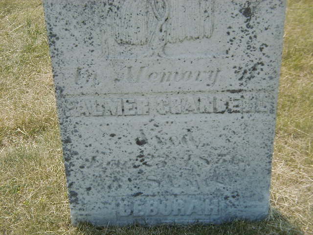 Note: There is another Crandell above Palmer: "Crandell, Abbot R; no land shown; 2 males over 16; 1 male under 16; 2 females over 16; 1 female under 16; Total: 6" Who is this? Does it refer to Reuben, brother of Palmer, who is in Malahide later on??? He appeared on the census of 1842 at Haldimand Twp., Northumberland Co., Ontario; 1842 Census: Palmer Crandell; Conc 1, Lot 7, Occupant; farmer. He appeared on the census of 1848 at Conc 1 Lot 7, Haldimand Twp., Northumberland Co., Ontario; 1848 Census: Palmer Crandell; Conc 1, Lot 7, Occupant; farmer. He appeared on the census of 1850 at Conc 1 Lot 7, Haldimand Twp., Northumberland Co., Ontario; 1850 Census: Palmer Crandell; Conc 1, Lot 7, Occupant; Total Persons: 4. He died on 23 January 1856 at Haldimand Twp., Northumberland Co., Ontario, at age 83; Datre Jan 23 1856 per Burial. per IGI Record. Date Jan 23 1856 & location Haldimand Twp. per GEDCOM of Keith Armstrong, Jan 8 2010.1,4,2 He was buried on 25 January 1856 at Salem Cemetery, Cramahe Twp., Salem, Northumberland Co., Ontario; Memorial: (See Exhibit) In Memory of; Palmer Crandell; Died; Jan 23, 1856; Aged 80? Years; Deborah.... (Salem Cemetery, June 5, 2005.)4