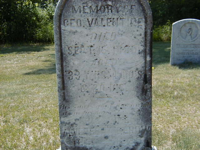 George Valentine Jr. was born on 26 April 1847 at Murray Twp., Northumberland Co., Canada West; Date Apr 26 1847 per Burial. Date 1847 & location Brighton Twp. per marriage reg'n. - Alvaretta Gerow.1,2 He appeared on the census of March 1852 at Brighton Twp., Northumberland Co., Canada West; Age 4 at 1851 Census: see George Valentine.3 He appeared on the census of April 1861 at Brighton Twp., Northumberland Co., Canada West; Age 14 at 1861 Census: see George Valentine.4 He lived on 14 April 1875 at Brighton Twp., Northumberland Co., Ontario; Residence Brighton Twp. per marriage reg'n. - Alvaretta Gerow.2 He married Alvaretta Gerow, daughter of Allan W. Gerow and Sarah Ann "Anna" Hennessey, on 14 April 1875 at Ameliasburgh Twp., Prince Edward Co., Ontario; Marriage Reg'n.#008007: Groom: George Valentine; Age: 27; Res. & Born: Brighton Twp; Status: bachelor; Occ.: farmer; Parents: G. ?Winters" & Caroline F. Philips; Bride: Alfaretta Jerow; Age: 23; Res. & Born: Wooler; Status: spinster; Parents: Allen W. Jerrow & Sarah A. Hennessy; Wit.: Wm. H. Valentine, Brighton & Agnes S. Jerrow, Wooler; Date: Apr 14 1875; Place: Ameliasburgh; Rel.: Friends & Meth; Performed by: Isaac Weldon; Reg'r.: H. F. Webb, Ameliasburgh (Ontario Marriage Registration, #008007-1875, ancestry.ca.)5,6 George Valentine Jr. lived in 1878 at Conc 4 Lot 28, Brighton Twp., Northumberland Co., Ontario; County Atlas: Name: G. Valentine, Jr; Conc & Lot: Conc 4, Lot 28 - 137.5 acres.7 He died on 15 September 1880 at Brighton Twp., Northumberland Co., Ontario, at age 33; Death Reg'n.#011354: Name: George Valentine, Jr; Date: Sep 15 1880; Age: 33y 4m 20d; Occ.: yeoman; Born: Brighton Twp; Cause: suicide; Phys.: none; Inf.: George Valentine, Sr., Brighton Twp; Reg'd.: Sep 17 1880; Rel.: Friend; Reg'r.: T. J. Wright, Brighton Twp. (Ontario Death Registration, #011354-1880, ancestry.ca) Date Sep 15 1880 per Burial.1,8 He was buried on 17 September 1880 at Wooler Friends Cemetery, Brighton Twp., Northumberland Co., Ontario; Memorial: (See Exhibit) In; Memory of; George Valentine; Died; Sep 17, 1880; Aged; 33 Y'rs & 4 Mo's; & 20 D'ys; His Wife; Alvereta Gerow; 1851 - 1930? (Wooler Friends Cemetery, July 3, 2004.)1
