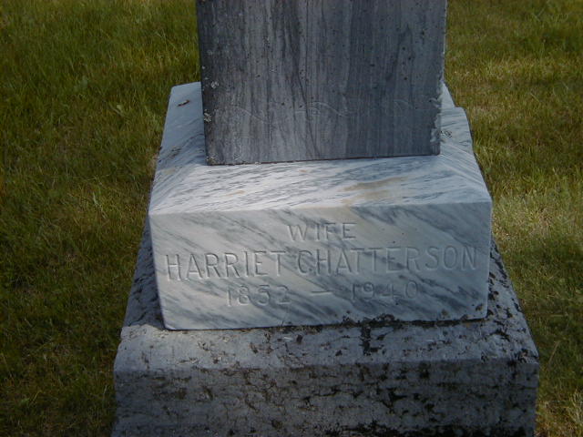Harriet Chatterson was born on 18 July 1852 at Northumberland Co., Canada West; Date Jul 18 1852 per 1901 Census. Date 1852 per Memorial. Date 1853 per 1861 Census. Date 1853 per "The George Chatterson Family", copied from original provided by Florence Chatten, June 4, 2005. per GEDCOM of Ray Swetman, July 8, 2004.1,2,3,4 She appeared on the census of April 1861 at Cramahe Twp., Northumberland Co., Canada West; Age 8 at 1861 Census: see George Chatterson.2 She appeared on the census of April 1871 at Brighton Twp., Northumberland Co., Ontario; Age 18 at 1871 Census: see George Chatterson.5 As of 3 September 1873,her married name was Carter. She married Charles Henry Carter on 3 September 1873 at Brighton Twp., Northumberland Co., Ontario; Date Sep 3 1873 per IGI Record. Date 1873 per "The George Chatterson Family", copied from original provided by Florence Chatten, June 4, 2005.6 Harriet Chatterson appeared on the census of April 1901 at Brighton Twp., Northumberland Co., Ontario; Age 48 at 1901 Census: see George Chatterson.3 She lived on 2 September 1935 at Ontario; per Death Notice of Shuter Smith Chatterson. She was buried in 1940 at Castleton Cemetery, Cramahe Twp., Castleton, Nothumberland Co., Ontario; Memorial: (See Exhibit) Wife; Harriet Chatterson; 1852 - 1940 (Castleton Cemetery, Castleton, Jun 25 2006)