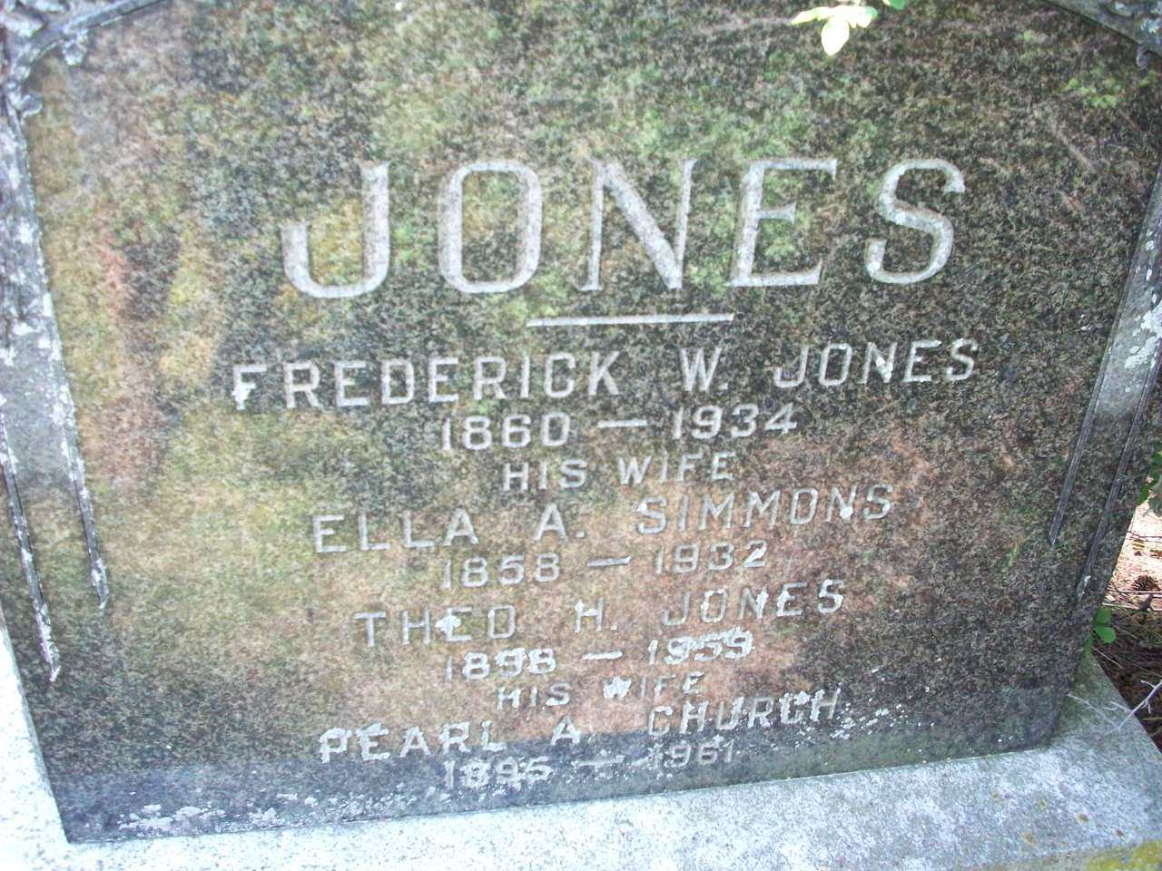 Frederick William Jones was born in 1860 at Cramahe Twp., Northumberland Co., Canada West; Date 1860 per Memorial. Date 1860 & location Ont. per 1891 Census. Date 1860 & location Ont. per 1881 Census. Date 1861 & location Ont. per 1871 Census. Date 1860 & location Cramahe Twp. per marr. reg'n. per GEDCOM of Don & Jeanne Ross, July 23, 2004.1,4,2,5,6,3 He appeared on the census of April 1871 at Cramahe Twp., Northumberland Co., Ontario; Age 10 at 1871 Census: see Joseph Jones.4 He appeared on the census of April 1881 at Cramahe Twp., Northumberland Co., Ontario; Age 21 at 1881 Census: see Joseph Jones.5 He appeared on the census of April 1891 at Cramahe Twp., Northumberland Co., Ontario; Age 31 at 1891 Census: see Joseph Jones.6 He married Ella Armethe Simmons, daughter of Levi Simmons and Rebecca Baker, on 4 April 1894 at Cramahe Twp., Northumberland Co., Ontario; Marriage Reg'n.#008732: Groom: Frederick William Jones; Age: 34; Res. & Born: Cramahe Twp; Status: bachelor; Occ.: farmer; Parents: Joseph & Harriet Jones; Bride: Ella Armethe Simmons; Age: 36; Res. & Born: Cramahe Twp; Status: spinster; Parents: Levi & Rebecca Simmons; Wit.: Geo. W. Gould, Colborne & Sarah A. Simmons, Frankford; Date: Apr 4 1894; Place: Cramahe Twp; Rel.: Meth; Performed by: Rev. R. H. Leitch; Reg'r.: H. P. Gould (Ontario Marriage Registration, #008732-1894, ancestry.com) " ... at Ella's parents home in Cramahe Twp. ... " per GEDCOM of Don & Jeanne Ross, July 23, 2004.1,7 Frederick William Jones died in 1934 at Ontario; Date 1934 per Memorial. Date 1934 per GEDCOM of Don & Jeanne Ross, July 23, 2004.1,3 He was buried in 1934 at Castleton Cemetery, Castleton, Northumberland Co., Ontario; Memorial: (See Exhibit) JONES; Frederick W. Jones; 1860 - 1934; His Wife; Ella A. Simmons; 1858 - 1932; Theo H. Jones; 1898 - 1959; His Wife; Peark A. Church; 1895 - 1961 (Castleton Cemetery, Castleton, July 13 2009, by Dan) per GEDCOM of Don & Jeanne Ross, July 23, 2004.1,3