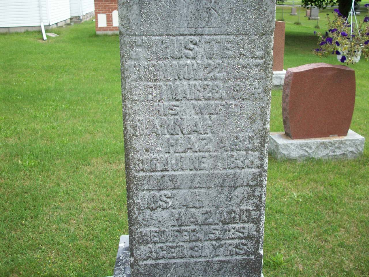 Josiah Hazard was born on 7 November 1810 at New York, U.S.A; Date 1810 per Memorial. Date 1811 & location USA per 1881 Census. Date 1818 & location US per 1861 Census. Date 1809 & location ? per 1851 Census. Date 1810 & location Ont. per Death Reg'n. Date Nov 7 1810 & location NY per IGI Record.1,2,3,4,5,6 He married Rachel White, daughter of Moses J. White Sr. and Jane Stinson Conger, on 19 October 1831 at Prince Edward Co., Upper Canada; Date Oct 19 & location Prince Edward Co. per GEDCOM of Doug Norman, Oct., 2, 2004. per IGI Record.1,7 Josiah Hazard appeared on the census of 1839 at Murray Twp., Northumberland Co., Upper Canada; 1839 Census: Josiah Hazard; 1 male over 16; 1 female over 16; 3 females under 16. He appeared on the census of 1850 at Conc 4 Lot 32, Murray Twp., Northumberland Co., Canada West; 1850 Census: Josiah Hazard; Conc 4, Lot 32, non-prop; 5 persons. He appeared on the census of 1852 at Brighton Twp., Northumberland Co., Canada West; Age 42 at 1851 Census: Hazard, Josiah, 42, b. ?, Second Adventist, married; Rachel, 40, b. Cda., Second Adventist, married; Anna, M., 15; Lot, 7; Sophia, 13.4 He married Sarah Louise Morrow, daughter of James Morrow and Margaret Smith, on 29 March 1858 at Brighton Twp., Northumberland Co., Canada West; per GEDCOM of Doug Norman, Oct., 2, 2004.1,7 Josiah Hazard appeared on the census of April 1861 at Brighton Twp., Northumberland Co., Canada West; Age 53 at 1861 Census: Hazard, Josiah, 53, b. US, EM, lab., married; Sarah, 50, b. Ireland, EM, married; Shearer, Margaret, 20, b. UC, single; C. L.(f), 18, b. UC, single; Rebecca, 16; O.L.?(f), 11; James, 9 (1861 Census: Brighton Twp., Northumberland Co., pg. 350 of 899, line 7 - ancestry.com.)3 He lived in April 1861 at Conc 3 Lot 36, Brighton Twp., Northumberland Co., Canada West; Residence per 1861 Census: conc 3, N 1/2 Lot 36, 100 acres.3 He appeared on the census of April 1881 at Brighton Twp., Northumberland Co., Ontario; Age 70 at 1881 Census: Hazard, Josiah, 70, b. USA, Irish, EM, farmer, married; Sarah, 69, b. Ireland, EM, married (1881 Census: Brighton Twp., Northumberland Co., dist 123, sub-dist. C, pg. 37, line 24 - ancestry.com.)5 He died on 15 February 1891 at Murray Twp., Northumberland Co., Ontario, at age 80; Death Reg'n.#010719: Name: Josiah Hazard; Date: Feb 15 1891; Age: 81y; Born: Ont., Occ.: farmer; Inf.: David Teal, Wooler; Reg'd.: Feb. 19 1891; Rel.: Friends; Reg'r.: W. R. Garratt (Ontario Death Registration, #010719-1891, ancestry.com)