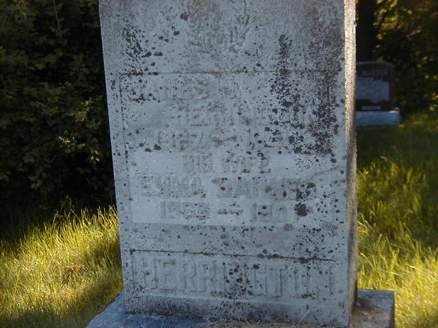 per CEMSearch record for James N. Herrington.1,8 Emma Barnes appeared on the census of April 1901 at Cramahe Twp., Northumberland Co., Ontario; Age 34 at 1901 Census: see Abel Herrington (father-in-law.)2 She appeared on the census of 1911 at Cramahe Twp., Northumberland Co., Ontario; Age 44 at 1911 Census: see James Herrington.3 She died in 1957 at Ontario; Date 1957 per Burial.1 She was buried in 1957 at Woods Cemetery, Cramahe Twp., Northumberland Co., Ontario; Memorial: (See Exhibit) James N; Herrington; 1887 - 1944; His Wife; Emma Barnes; 1866 - 1957 (Woods Cemetery, Cramahe Twp., July 3 2004)