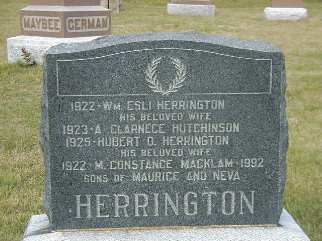 CEMSearch: Name: M. Constance Herrington; Maiden: Macklam; born: 1922; Died: 1992-02-21; Notes: Married Hubert Herrington Dec 1947, Mother of Jean Breckles; Buried: Carman Cemetery, Brighton Twp; Other names: A. Clarnece Herrington (Hutchinson) (1923- ), Edward Maurice Herrington (1897-1975 ), Hubert Daniel Herrington (1925- ), Iva Miva Herrington (Fiddick) (1908-1969), M. Constance Herrington (Macklam) (1922-1992), Neva Millicent Herrington (Frost) (1902-1940), William Esli Herrington (1922-.1 )
