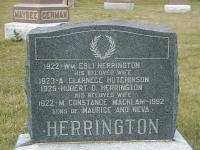 William "Esli" Herrington was born on 10 February 1922 at Brighton Twp., Northumberland Co., Ontario; Date Feb 10 1922 per CEMSearch. Date 1922 per Memorial. Date 1922 - 1st son by 1st wife per CEMSearch record of Edward Maurice Herrington.1,2 He married A. Clarnece Hutchinson, daughter of James "Lorne" Matthew Hutchinson and Jessie Marie Somerville, on 19 September 1945 at Ontario; Date Sep 19 1945 per CEMSearch record for William Esli Herrington.1 William "Esli" Herrington died on 31 October 2004 at Brighton Twp., Northumberland Co., Ontario, at age 82; Date Oct 31 2004 & location Home in Brighton Twp. per Rebecca Staines (Herrington), Feb 20, 2012.3 He was buried on 3 November 2004 at Carman Cemetery, Brighton Twp., Northumberland Co., Ontario; Memorial: (See Exhibit) 1922 - Wm. Esli Herrington - ; His Beloved Wife; 1923 - A. Clarnice Hutchinson - ; 1925 - Hubert D. Herrington - ; His Beloved Wife; 1922 - M. Constance Macklam - 1992; sons of Maurice and Neve; HERRINGTON (Carman Cemetery, Brighton Twp.)